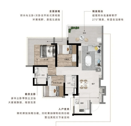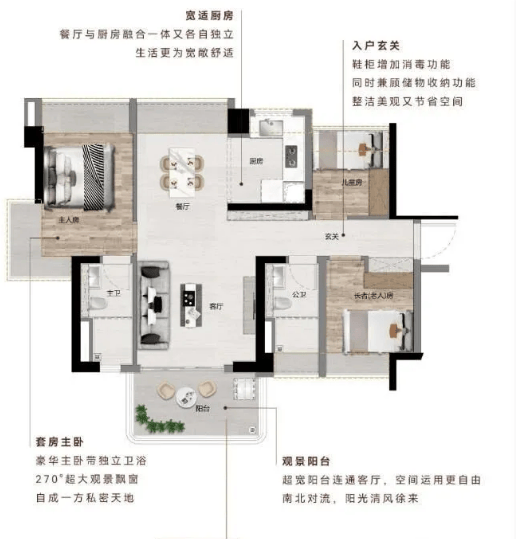 【03户型 建面约88㎡ 3房2厅2卫】:作为项目货量最多的户型,占3条梯腿,性价比极高。户型南北通透,通风采光俱佳;主卧配备270°飘窗及双飘窗设计,既增加了室内使用空间,又能享受多角度景观,闲暇时可在此看书、观景,惬意十足;南向观江景阳台,推窗即见珠江美景,让刚需户型也能拥有诗意生活。