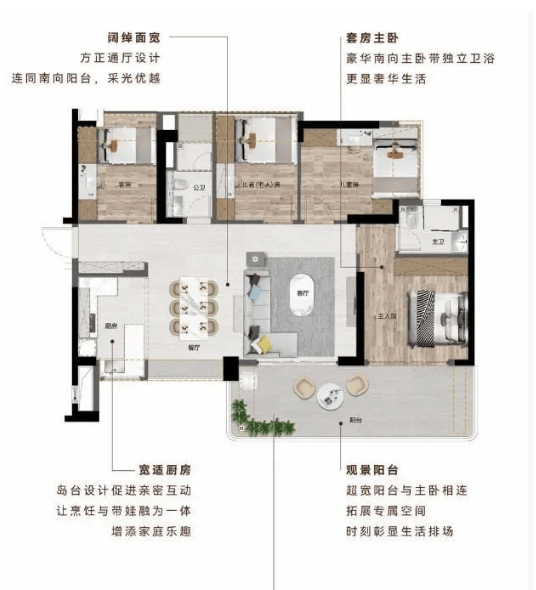 【02户型 建面约108㎡ 4房2厅2卫】:南向无遮挡设计,确保室内充足采光,同时能最大程度享受江景资源;U型厨房布局,操作空间宽敞,动线合理,烹饪效率更高;IMAX版客厅设计,空间感十足,与阳台相连,延伸室内活动空间,无论是家庭聚餐还是休闲娱乐,都能轻松满足。