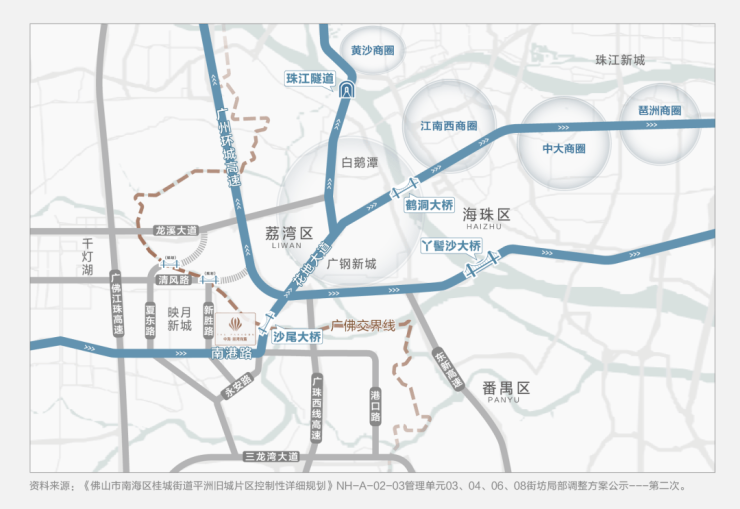 四横四纵三桥一环的多维立体交通网络使得通达广佛两市变得异常方便。