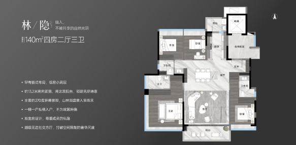 140平方米户型:该户型采用豪宅主流LDKG一体化设计,拥有超高使用率和灵活的空间布局。54平米无边社交方厅,将公区空间的宽敞通透展露无遗,同时配备双主套、双阳台等设计,提升居住品质。