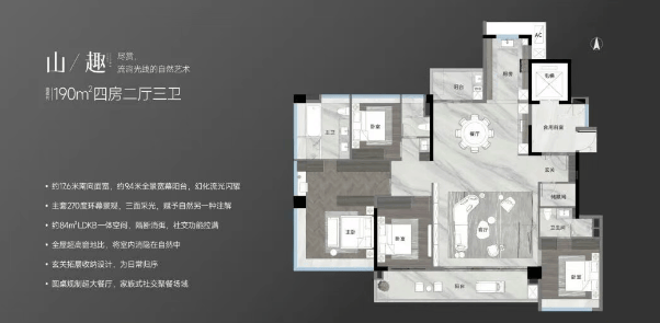 190平方米户型:该户型同样采用板楼设计,享有中轴园林景观,户型为低密板楼设计,这在市中心较为少见。全屋窗地比高达38%,主卧设置270°大飘窗,极大地拓展了室内的空间感。