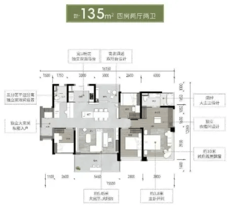 建面约135㎡四房两厅两卫,面向改善型需求,空间开阔,功能分区合理,居住舒适度拉满。该户型在空间设计上更加注重品质感与私密性,无论是大尺度的客厅、餐厅,还是舒适的卧室,都能满足追求品质生活的家庭需求。全系标配中央空调,同时首创“交付选配方案”,业主可以根据自己的爱好,针对入户/客厅地砖、厨房岛台岩板、卫生间墙裙等局部空间选材,还提供加载个性化定制服务供客户选择,让家不再是千篇一律的样板间复制品。