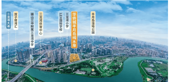 华侨城半月岛纯水岸位于佛山三龙湾半月岛湿地公园旁,占据着广佛中心地位,是广佛桥头堡三龙湾半月岛最中央、最后江园板块,堪称中心中的中心,完全媲美广州二沙岛的顶奢生活版图。