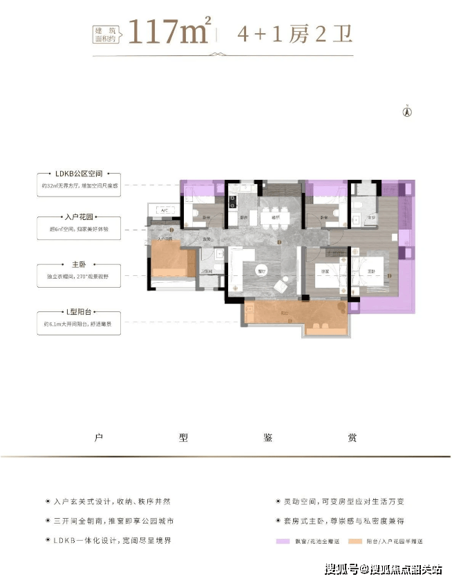 117㎡户型:竖厅设计,阳台宽大,整体布局合理,舒适度高。