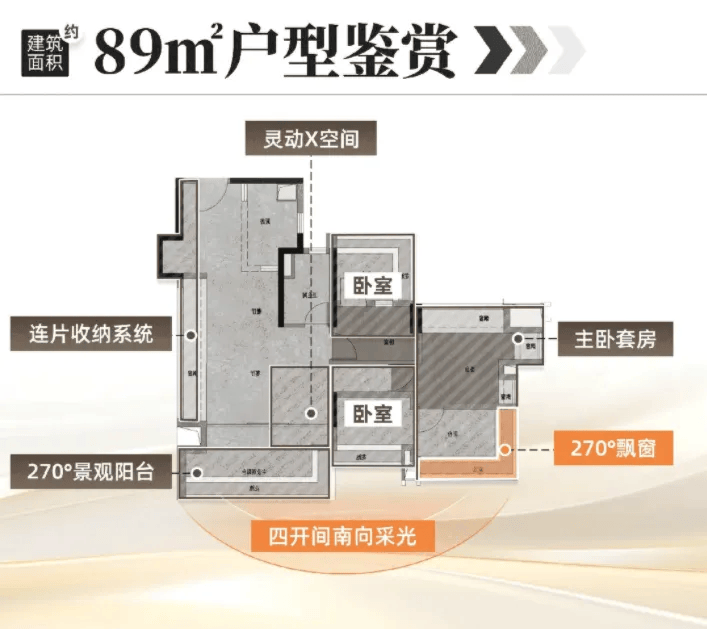 88-89㎡三房:主力刚需户型,四开间朝南,客厅开间约 5.2 米,采光超棒,主卧带独立卫浴和飘窗,总价 490-550 万,适合海珠、越秀上班的年轻家庭。