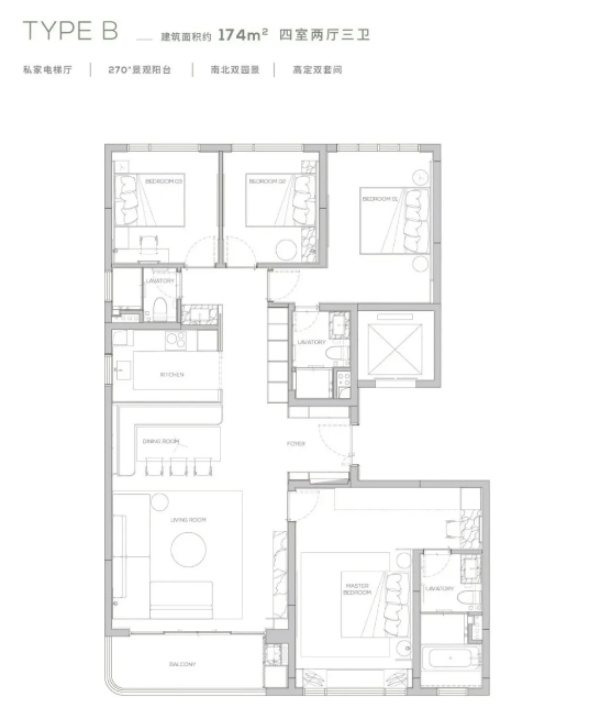 项目主推 145-315㎡多种户型,全部为纯板式南北对流设计,空间布局方正,采光通风极佳。部分户型配备 270° 环幕阳台、巨幕宽厅,视野开阔,可俯瞰湖景或园林;大户型(如 260-315㎡)更注重空间分层与功能分区,主卧带独立卫浴与步入式衣帽间,满足多代同堂或高端社交需求。无论是 145㎡的改善三房,还是 315㎡的顶奢五房,均以大面宽、短进深为设计原则,最大化提升居住舒适度,适配不同规模的高净值家庭。