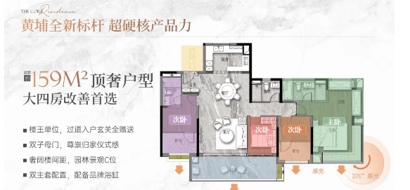 项目主打高使用率户型,使用率达 100%,在区域内极具竞争力。目前主要在售 2 号楼(47 层,2 梯 4 户,92-159㎡)、3/5/6 号楼(47 层,3 梯 6 户,81-89-116㎡),加推的 7 号楼则拥有东南向无遮挡瞰中心园林及公园、西南向高区瞰珠金琶甚至广州塔的优越景观。户型覆盖 81-159㎡,从刚需小三房到改善型四房均有选择,无论是单身青年、新婚家庭还是多子女家庭,都能找到适配的居住空间。围合式布局与合理的梯户比设计,既保障了居住私密性,又提升了空间利用率与通风采光效果,进一步优化居住体验。