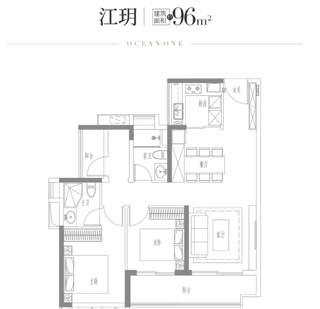 建面约96㎡竖厅户型:该户型设有6.4米景观阳台,三开间朝南,采光通风良好,非常适合小家庭居住。