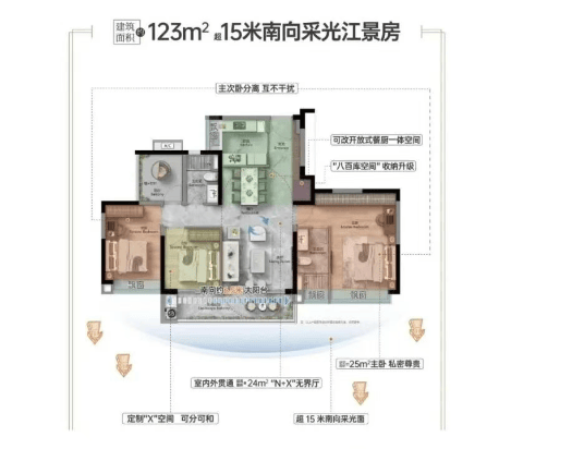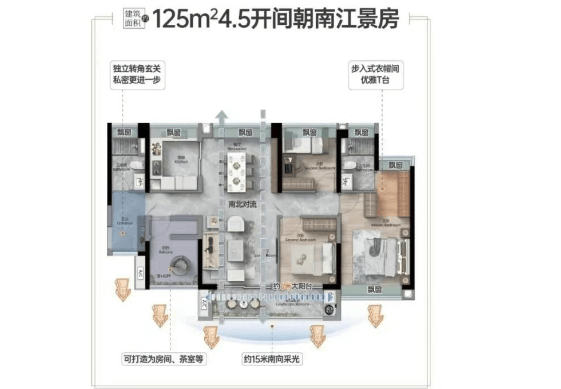 建面约125㎡王牌户型:拥有4.5开间朝南,15米采光面,主次卧双南向,空间宽敞明亮,适合追求高品质生活的家庭。