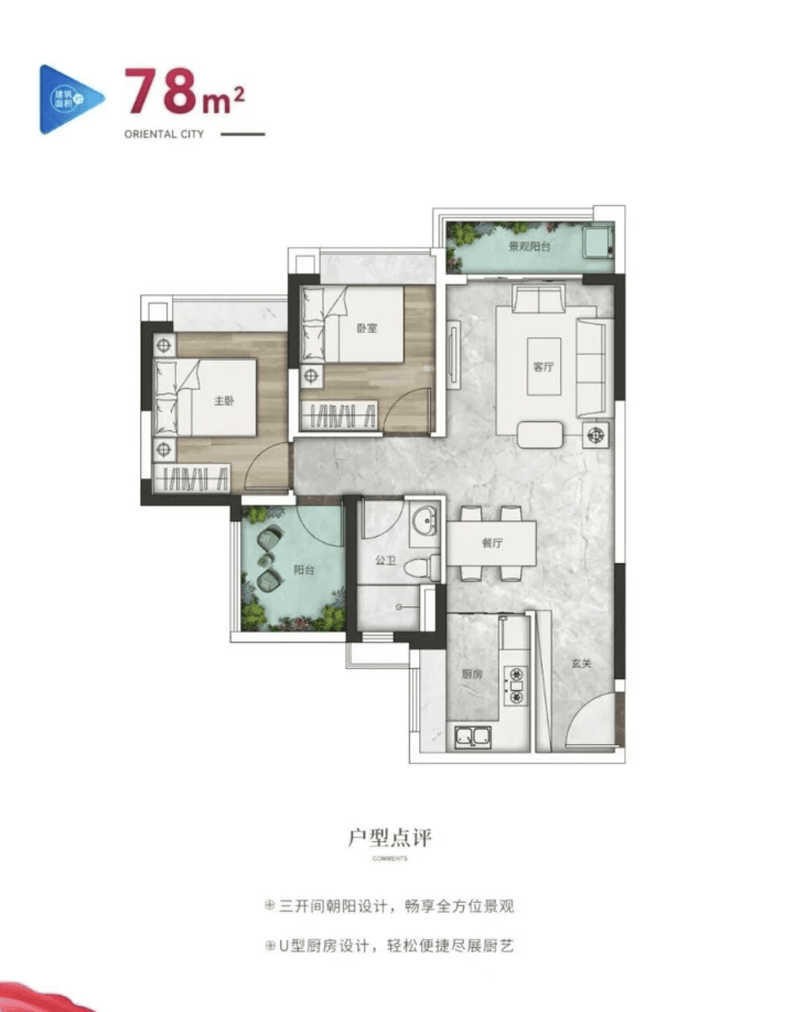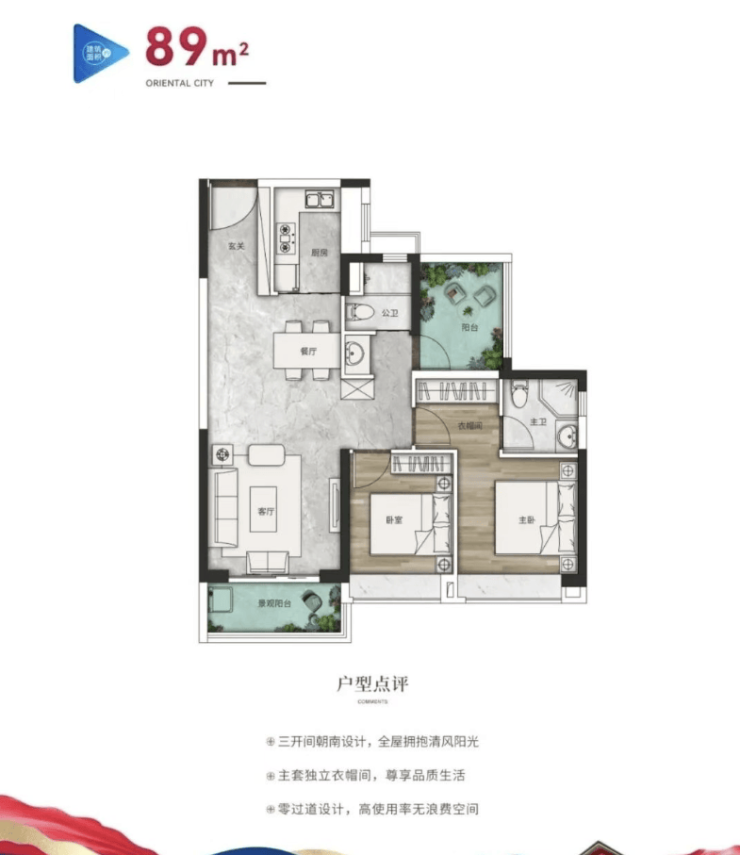 89㎡三房两厅两卫:三开间朝南,主卧带270°转角飘窗,U型厨房,得房率85%;