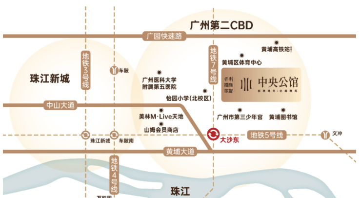 交通通达度直接决定房产的流动性。项目距离地铁5号线大沙东站直线距离仅约500米,5号线作为广州东西大动脉,可一线直达珠江新城、金融城。同时临近地铁7号线二期(已通车),可一线直达广州南站、大学城、萝岗。地面交通方面,广园快速、黄埔大道等主干道环伺,30分钟内可直达天河。