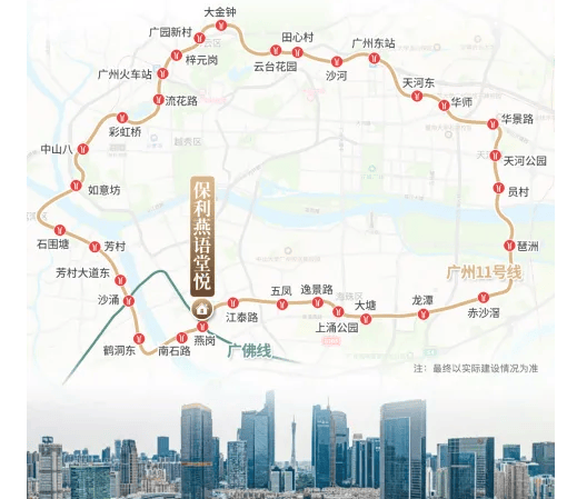 4. 广州11号环线即将通车,串联全城核心区域。据悉,广州首条地铁环线——11号环线土建工程已完成98%,将于2026年内通车,该线路贯穿广州多个核心区域,可换乘多条地铁线路,成为“换乘之王”,极大提升广州公共交通便捷度。保利燕语堂悦作为11号环线燕岗站地铁上盖项目,将直接受益于线路通车,出行更加便捷,物业价值也将进一步提升。