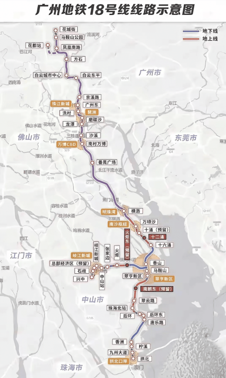 18号线链接的城市[珠海(通澳门)⇋中山⇋南沙万顷沙(通香港)⇋南沙横沥⇋番禺⇋海珠⇋天河⇋白云⇋花都⇋清远]。