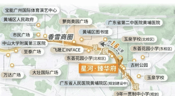 尽管项目距离现有地铁6号线香雪站约2.1公里,需短途接驳,但其区位优势不可忽视。星河臻华府地处开创大道与开源大道交汇处,这两条主干道是科学城东西向交通大动脉,向东连接云埔工业区,向西直通天河智慧城与金融城。通过广园快速路、京港澳高速,自驾30分钟内即可抵达天河CBD腹地,极大便利在科学城、金融城、鱼珠乃至番禺工作的都市精英。