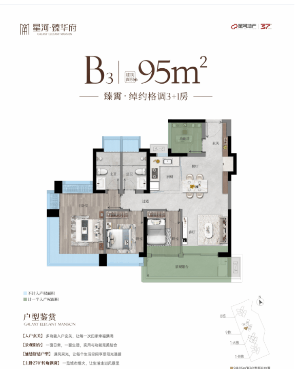 尤为值得一提的是,项目采用广州最新住宅设计规范打造,实用率接近100%,真正实现“所见即所得”。无论是85㎡三房实现客厅+三卧室全南向布局,还是95㎡灵动3+1空间、105㎡全南向四房、125㎡奢阔四室,均通过LDKG一体化宽厅、270°全景飘窗、迎宾入户花园等创新设计,最大化空间效能与居住体验。户户朝南、通透采光、山景视野,让每一寸面积都物超所值。