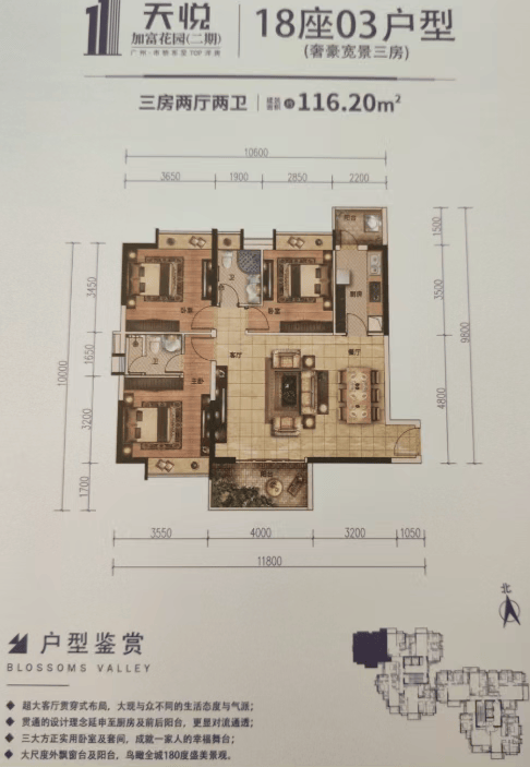 极致多样的户型图谱与全龄段的空间哲学 走进加富天悦的户型世界,仿佛步入了一座精心设计的空间艺术馆,每一种户型都蕴含着对生活场景的深刻洞察,都试图在不同的面积段内,挖掘出居住的无限可能。18栋与19栋,如同两艘承载幸福的巨轮,各自拥有独特的户型布局,满足了从单身贵族到三代同堂的各种需求。让我们先将目光投向18栋,那里的01户型,建面约111.58平方米,被赋予了“奢阔尚层大三房”的美誉,三房两厅三卫的格局,简直是改善型家庭的梦想之选,三个卫生间的设计,彻底解决了早高峰时段家人抢厕所的尴尬,让每一个清晨都变得从容优雅;而03户型,建面约116.20平方米,“奢豪宽景三房”,同样以三房两厅两卫的配置,强调了“宽景”的概念,或许那超大的阳台、那开阔的视野,正是为了让居住者能够将窗外的风景尽收眼底,让心灵在自然中得到舒展。对于追求精致生活的年轻夫妇或丁克家庭,18栋的02户型(86.36平方米)和05户型(88.90平方米)提供了完美的解决方案,两房两厅两卫或一卫的设计,既保证了空间的独立性,又控制了总价门槛,尤其是02户型的双卫配置,在小面积段中实属罕见,体现了设计师对人性的关怀。当然,还有那个已经售罄的04户型(60.63平方米),它的热销证明了市场对低总价、高实用性小两房的渴望。转至19栋,户型的多样性更加令人惊叹,01户型(101.45平方米)“添悦盛美大三房”,以紧凑的三房两厅两卫布局,实现了功能与舒适的最佳平衡;03户型(111.99平方米)“卓悦豪庭三房”和05户型(118.34平方米)“天悦聚美三房”,则将大三房的舒适度推向了新的高度,宽敞的客厅、明亮的卧室,每一个角落都散发着家的温馨。即便是93.71平方米的02户型“喜悦唯美大两房”,也通过两房两厅两卫的设计,展现了空间利用的极致智慧。虽然51.57平方米的04户型“欢悦大天地”已售罄,但它曾经的存在,证明了加富天悦对于刚需群体的包容性。这些户型,不仅仅是数字的排列组合,更是对生活方式的精准定义,它们用不同的尺度,丈量着幸福的宽度,用不同的格局,承载着梦想的重量,让每一个选择加富天悦的人,都能找到属于自己的那片天空。