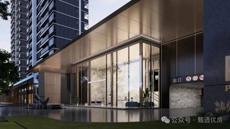 大良东区首个酒店式归家大堂设计,近50米宽8米高的高奢社区大门,酒店式环岛落客区,大堂外挑5米,出行不受风雨影响,人车动线分离。