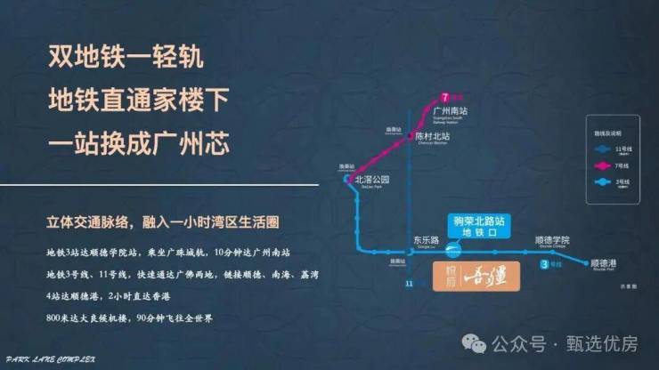 🚇下楼即达3号线,一站换乘广州芯已经开通的佛山地铁3号线,驹荣北路地铁站口即小区门口,3号线是佛山最长的地铁线,37个站,直达北滘,禅桂中心,被称为佛山南北大动脉。佛山地铁11号线规划中的东乐路站换乘直达广州老城芯荔湾区。