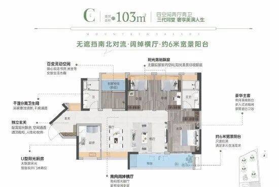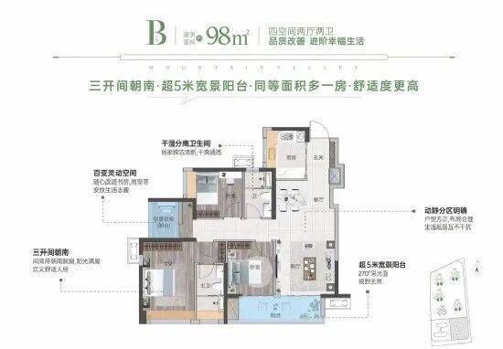 伴山溪谷提供多种户型选择,包括约85㎡三房两厅两卫、98㎡四房两厅两卫以及103㎡四房两厅两卫(横厅),满足不同家庭结构的需求。这些户型设计注重空间利用效率和居住舒适度,例如超宽阳台的设计,让住户可以享受更开阔的视野和充足的自然光线。