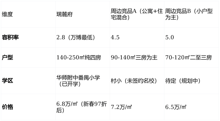📊 分析:竞品B虽价格低,但户型小、学区不确定,难以满足改善需求;竞品A户型与瑞麓府重叠,但容积率高、社区不纯粹,未来二手溢价空间有限。瑞麓府的“低密+纯大户型+确定学区”,是万博板块“终极改善”的唯一选择。