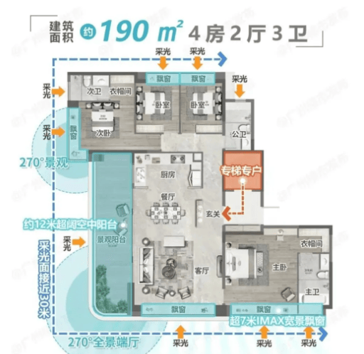 建面约217-218㎡户型,规划5室2厅3卫,适合多人口家庭居住,空间宽敞明亮,3.25米墅级层高让室内更显通透大气;梯户比为三梯三户,出行便捷,私密性强;客厅采用大面宽设计,搭配全景落地窗,40%窗地比让室内采光充足,推窗即揽山景园林;次卧均为大尺度设计,可根据需求改造为儿童房、书房、客房等,灵活性强。建面约230-300㎡大平层,定位高端改善,规划5室2厅4卫及以上,采用豪华装修标准,配备超大空中花园、独立电梯入户、中西双厨等特色设计,部分户型预留茶室、影音室空间,满足高端家庭的居住品质需求,尽显尊贵格调。