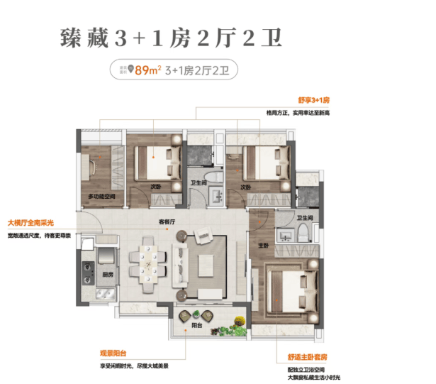 建面约89㎡:4房2厅2卫,格局方正,南北对流,大横厅南向采光、通风、观景,比同户型价格更低。
