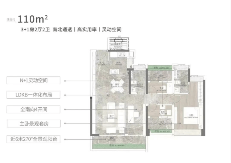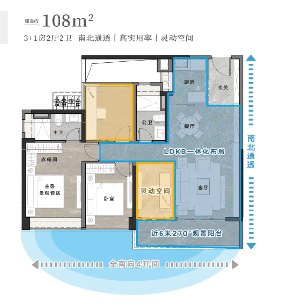 建面约128㎡四房户型,适合改善家庭居住,能满足一家四口或五口的居住需求。该户型采用南北双阳台设计,南北对流,采光通风极佳,客厅面宽约4.5米,搭配8米L型阳台,视野开阔,能最大化引入自然景观。四个卧室布局合理,其中两个卧室为南向,两个卧室为北向,主卧套房设计,配备独立卫浴和衣帽间,私密性强,另外三个卧室空间宽敞,可根据家庭需求改造为儿童房、老人房、书房等,实用性极强。得房率高达98%,空间利用率极高,每一寸空间都得到充分利用,让居住更舒适、更便捷。