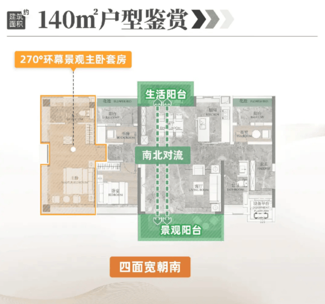 建面约140㎡4+1房户型,是改善型家庭的优选,适合追求高品质居住体验的家庭。该户型南向采光面达15.7米,南北双阳台设计,南北对流,采光通风俱佳,客厅面宽约5.0米,搭配全景飘窗,空间开阔,彰显大气。主卧套房设计,配备270度折叠屏飘窗,视野开阔,能欣赏到社区园林和青山绿意,独立卫浴和衣帽间设计,满足业主的个性化需求。4+1房的设计,既能满足家庭人口增加后的居住需求,也能预留出一个灵活空间,作为书房、健身房或儿童游乐区,实用性和灵活性极强。得房率高达100%,实际使用空间远超同面积段其他楼盘,居住舒适度拉满。