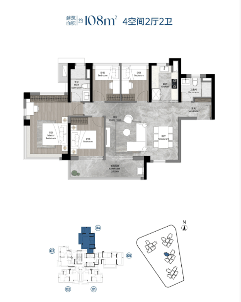 建面约 108㎡四房两厅两卫:超高使用率,实际居住体验堪比传统 120㎡户型,南北通透,适合三代同堂或多孩家庭。