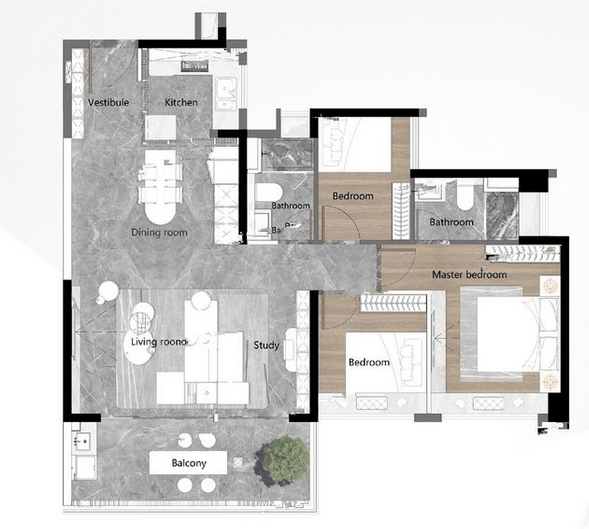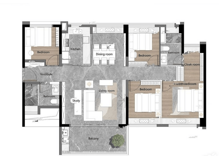 建面约136㎡四房两厅两卫:270°转角观景阳台,南北对流,预留中西厨空间,适合三代同堂。