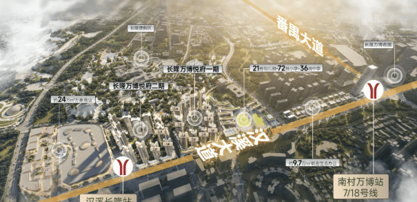 长隆万博悦府坐落于广州市番禺区,是集商业、住宅和文旅于一体的超级综合体。项目占地面积约91万平方米,其中包含24万平方米的万象系商业综合体、约51万平方米的住宅、约9.7万平方米的商业组团,以及包括72班小学+36班中学+21班幼儿园在内的教育配套。