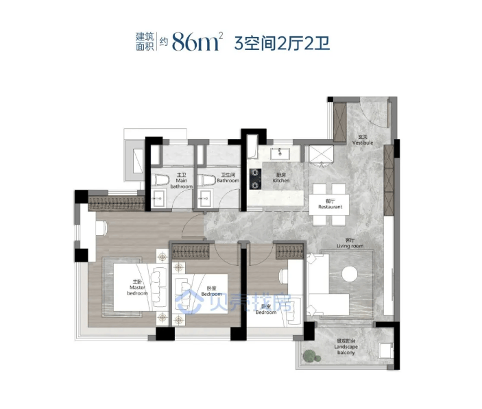 建面约88㎡三房两厅两卫:刚需首选,紧凑实用:该户型为刚需首选户型,四开间朝南,采光通风俱佳。入户玄关处配备L型收纳柜(花池报建,全赠送),入户花园以阳台报建,只计算一半面积,可作为入户通道、餐厅使用,空间灵活。客厅拥有L型采光面,搭配飘窗设计,室内空间明亮通透;主卧三面飘窗,一侧作为整面衣柜,另一侧摆放梳妆台,还有约270°观景视野,私密性和舒适度兼具。