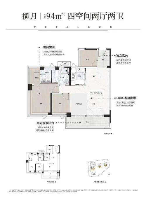 项目主推建筑面积75至108平方米三至四房户型,户型设计兼顾空间实用性与采光舒适度。75平方米三房户型实现南向四开间布局,主卧配270°环幕飘窗,充分提升采光和景观视野。94平方米四房户型采用LDKG一体化设计,约6.4米阳台连通客厅,客餐厅空间通透、灵活可变。108平方米四房户型南北对流,约7.2米阔景阳台加上15米南向面宽,空间尺度在同面积段中具备明显优势,兼顾居住舒适性和功能多样性。整体户型布局合理,客厅与餐厅、厨房与阳台动线顺畅,储物空间充足,满足家庭生活、休闲和娱乐需求,同时为二孩或多代同住提供充足空间,彰显高使用率和居住灵活性。