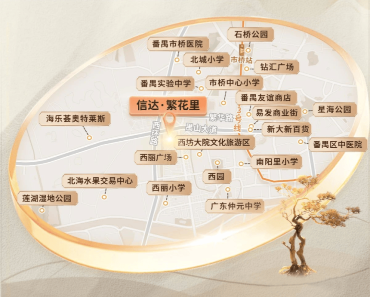 信达繁花里周边生活配套成熟,步行可达易发商业街和钻汇广场,提供日常购物、餐饮和休闲便利。周边大型商圈如奥园广场、永旺梦乐城驱车约10分钟即可覆盖,为居民提供多样化的消费和娱乐选择。医疗配套方面,番禺中心医院、何贤纪念医院均在3公里范围内,确保家庭成员健康保障充足。生态与休闲资源方面,项目临近市桥水道,周边环绕大夫山森林公园、莲湖生态公园等五大公园,小区自带园林约1.5万平方米,融合滨水景观、榕下休闲空间和儿童活动区域,为居民提供高品质生活环境。整体配套结合成熟商业氛围与生态景观,兼顾便利性与宜居性,为刚需家庭提供生活便利与休闲享受。