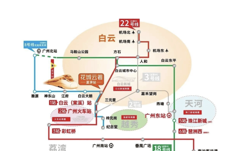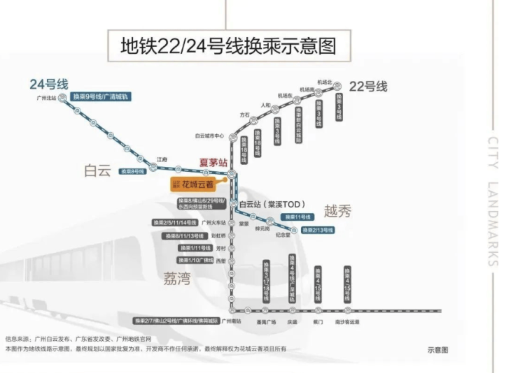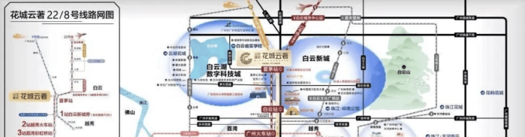 花城云著紧邻22号线北延段和8号线支线夏茅站,约50米即可到达地铁口,通勤至珠江新城、越秀及白云站等核心商圈仅需数站。同时22号线北延段贯穿南北大动脉,串联广州主要枢纽和机场,实现多条地铁线高效换乘。