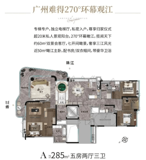 总统套房式大宅:270°全景视野,三面环江景观。