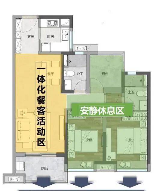 入户门、客厅、阳台形成了一条流畅的南北对流轴线。当您推开家门,清新的空气迎面而来,视线穿过宽敞的客厅直达阳台,整体空间显得明朗开阔,毫无压抑感。客厅连接着超大景观阳台,这里是您休闲品茶、观景赏花的最佳场所,也是孩子玩耍嬉戏的安全天地。