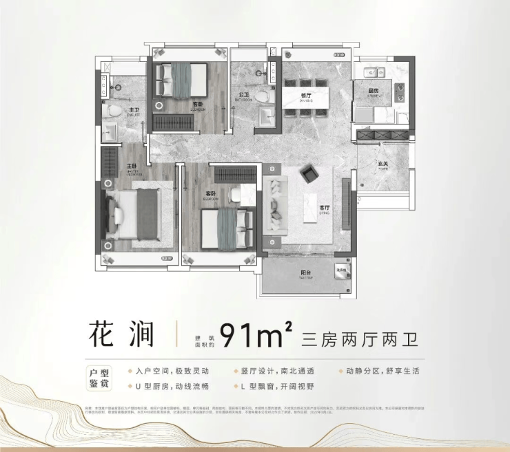 91㎡三房两卫户型,主打刚需上车需求,采用全明格局设计,四开间朝南,最大化提升室内采光与通风效果。户型布局紧凑合理,无浪费空间,U型厨房设计符合人体工学,操作空间充足,方便日常烹饪;客厅连接景观阳台,拓展室内视野与活动空间,同时让自然光线充分进入室内。主卧配备独立卫生间,保障业主隐私,次卧空间充足,可根据需求打造为儿童房、书房等,满足家庭多元使用需求。