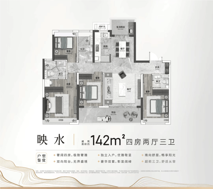 142㎡四房两卫户型,面向改善型家庭,采用南北通透格局,空间开阔明亮,得房率高。户型布局合理,公共区域与私密区域分区明确,客厅连接超大景观阳台,部分房源可享帽峰山景与社区园林景观;主卧套房设计,配备独立卫生间、衣帽间与观景飘窗,营造舒适私密的居住体验。多功能房可根据需求打造为儿童房、老人房、书房或健身室,适配二胎家庭或三代同堂的居住需求,满足家庭长远居住规划。