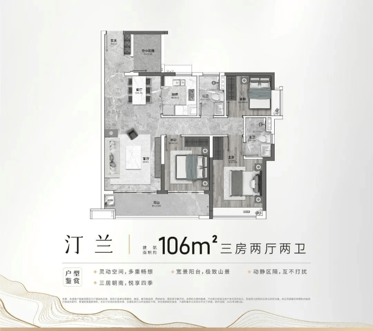 106㎡三房两卫户型,定位刚改家庭,采用LDK一体化设计,将客厅、餐厅、厨房相连,打造通透开阔的公共空间,方便家庭互动与日常社交。户型配备6米大阳台,兼具观景与实用功能,可晾晒衣物、摆放休闲家具,打造专属休闲空间。主卧为套房设计,配备独立卫生间与衣帽间,提升居住舒适度与私密性;次卧与书房空间灵活可变,能适配家庭不同阶段的使用需求,实用性极强。