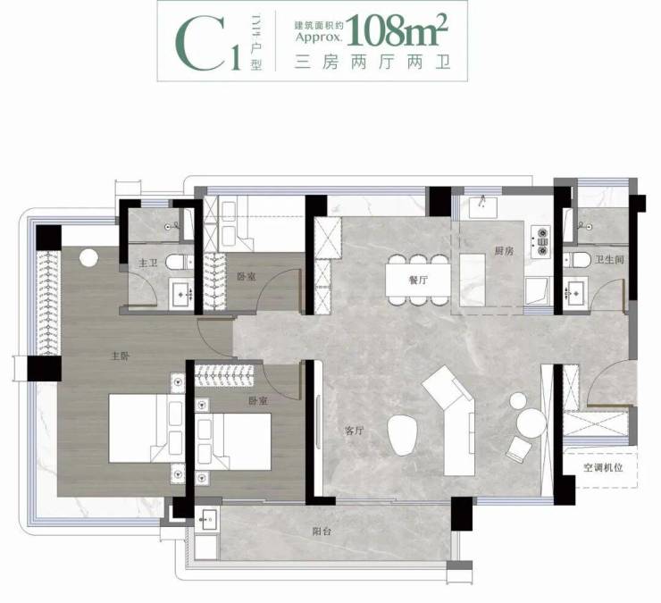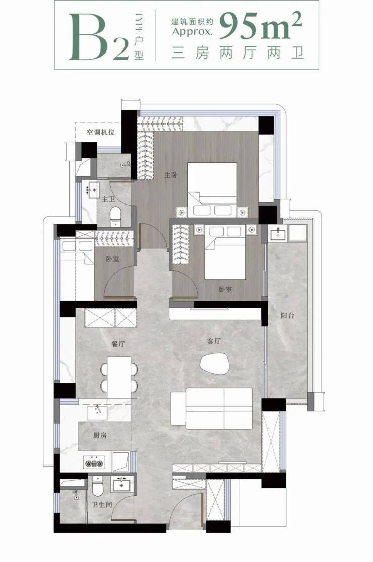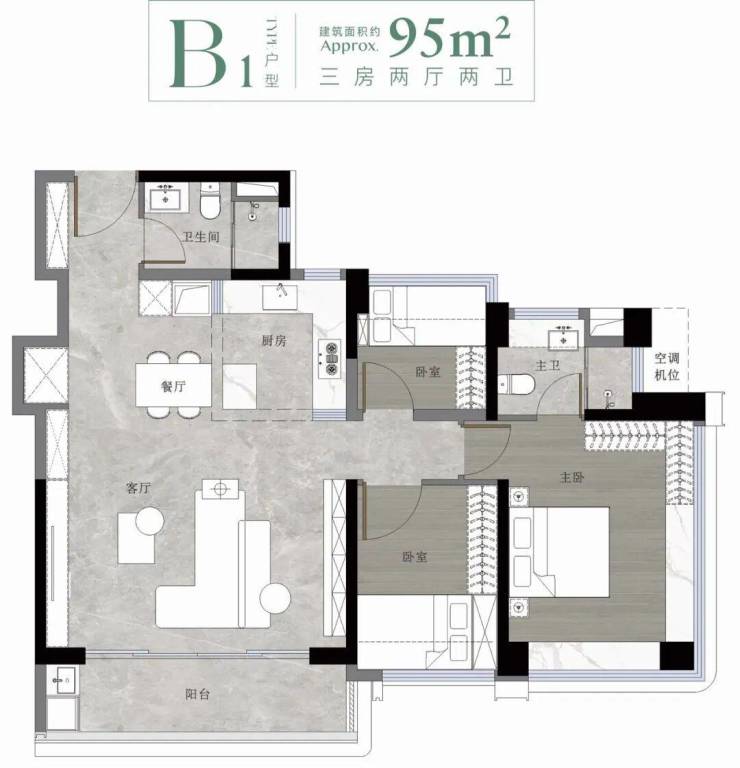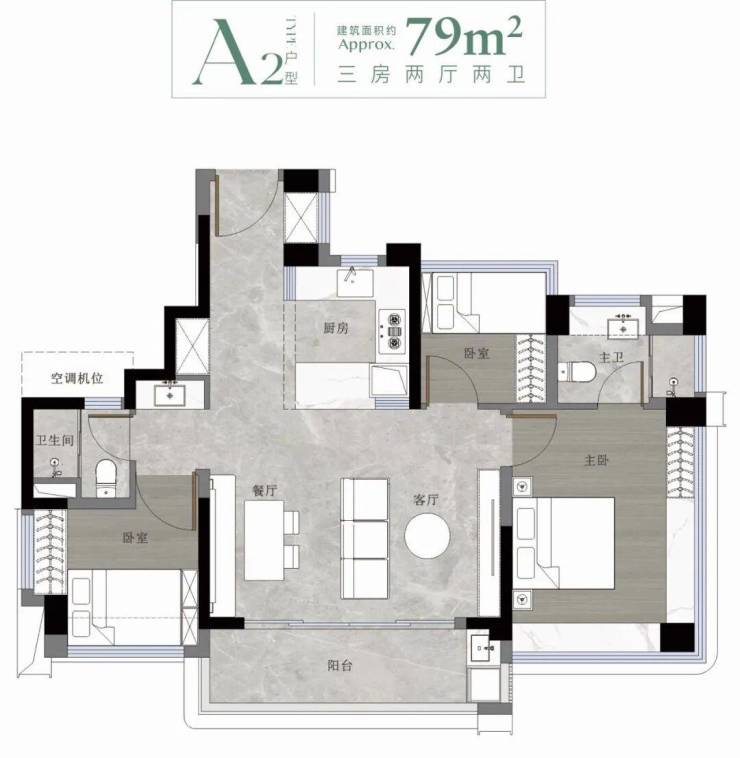 79㎡三房:紧凑而不局促,三开间朝南,主卧带飘窗,厨房预留双开门冰箱位,阳台连通客厅,采光通风俱佳。适合刚需上车或年轻小家庭,总价门槛相对友好。