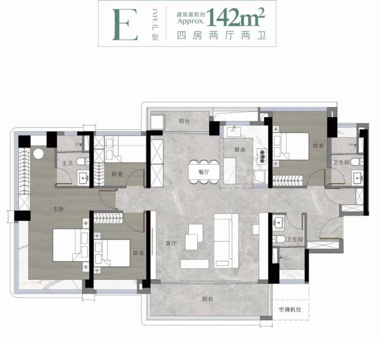 142㎡改善四房:定位高端改善,四开间朝南,LDK一体化布局,主卧带独立衣帽区和卫浴,南北通透,部分高层单位可远眺龙头山绿意。收纳系统全面升级,玄关、阳台、卧室均按人体工学定制储物空间,提升长期居住的便利性。