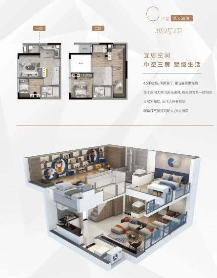 C户型:建筑面积约58㎡,宜居空间,三房布局,配备燃气管道可生明火。