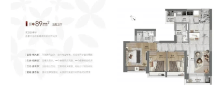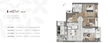 87-89㎡三房两卫:带主套设计,89㎡实现四开间朝南,三房均配大飘窗;