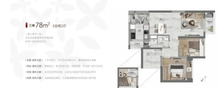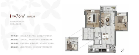 76-78㎡三房一卫:三开间望江,私密玄关+生活阳台,主次卧均享江景视野;