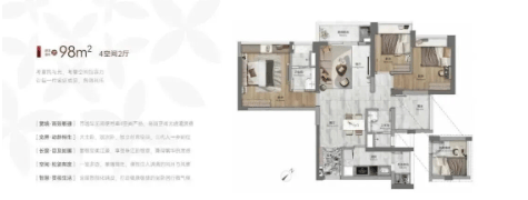 98㎡四房两卫:全屋智能化预埋,双阳台+大主卧,一步到位满足多孩家庭;