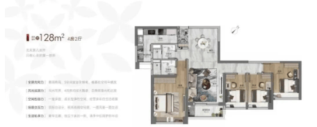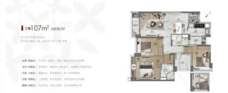 107㎡四房两卫:五开间朝南,竖厅设计+餐客一体,每房均赠大飘窗;