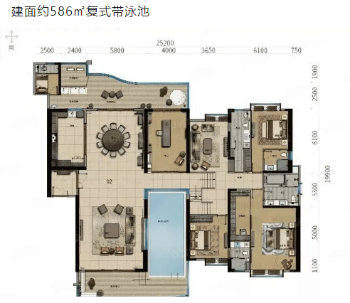 复式公寓:建面约586平方米,同样配备私人泳池。