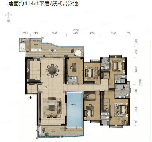 平层/跃式公寓:建面约328平方米至500平方米,部分带泳池设计。