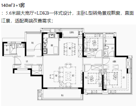 140平方米3+1房:5.6米超大宽厅+LDKB一体式设计,主卧L型转角景观飘窗,直面江景。